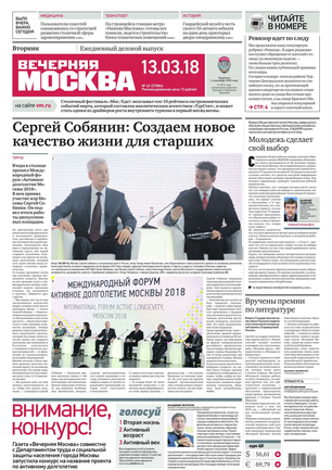 «Вечерняя Москва» — ежедневная российская вечерняя газета, старейшее из вечерних изданий в России, учрежденное в 1923 году. Выходит пять дней в неделю, кроме субботы и воскресенья. Отличается тем, что рассказывает о событиях еще не завершившегося дня. Оперативно освещает хронику и особенности жизни Москвы, охватывает все слои общества и большинство профессиональных и возрастных групп читателей.Издание представлено тремя выпусками – утренним ежедневным, вечерним (выходит три раза в неделю), еженедельным (выходит по четвергам).