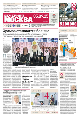 «Вечерняя Москва» — ежедневная российская вечерняя газета, старейшее из вечерних изданий в России, учрежденное в 1923 году. Выходит пять дней в неделю, кроме субботы и воскресенья. Отличается тем, что рассказывает о событиях еще не завершившегося дня. Оперативно освещает хронику и особенности жизни Москвы, охватывает все слои общества и большинство профессиональных и возрастных групп читателей.Издание представлено тремя выпусками – утренним ежедневным, вечерним (выходит три раза в неделю), еженедельным (выходит по четвергам).