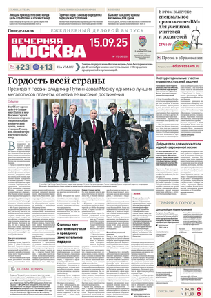 «Вечерняя Москва» — ежедневная российская вечерняя газета, старейшее из вечерних изданий в России, учрежденное в 1923 году. Выходит пять дней в неделю, кроме субботы и воскресенья. Отличается тем, что рассказывает о событиях еще не завершившегося дня. Оперативно освещает хронику и особенности жизни Москвы, охватывает все слои общества и большинство профессиональных и возрастных групп читателей.Издание представлено тремя выпусками – утренним ежедневным, вечерним (выходит три раза в неделю), еженедельным (выходит по четвергам).