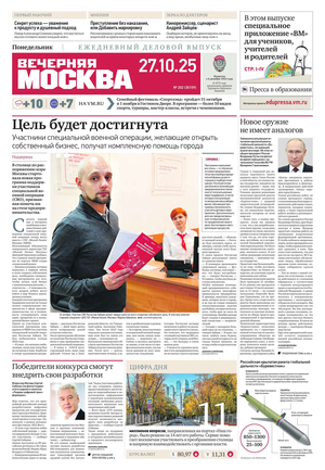 «Вечерняя Москва» — ежедневная российская вечерняя газета, старейшее из вечерних изданий в России, учрежденное в 1923 году. Выходит пять дней в неделю, кроме субботы и воскресенья. Отличается тем, что рассказывает о событиях еще не завершившегося дня. Оперативно освещает хронику и особенности жизни Москвы, охватывает все слои общества и большинство профессиональных и возрастных групп читателей.Издание представлено тремя выпусками – утренним ежедневным, вечерним (выходит три раза в неделю), еженедельным (выходит по четвергам).