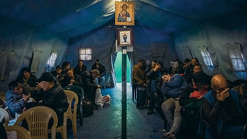 Минуя прицеп, в котором оборудована прачечная со стиральными машинами для бездомных, и прицеп с душем для них же, Роман входит в большую теплую и темную палатку. Здесь на пластиковых стульях, ряды которых разделены узким проходом, сидят люди лицом к входу. С задней стороны имеются окошко и узкая треугольная прореха, откуда проникает весенний свет, прокладывая на полу палатки узкую прозрачную полосу. Роман идет по ней, вглядываясь в лица сидящих на стульях. У всех такое выражение, будто они собрались смотреть мрачную пьесу, которая в их жизни давно уже идет не заканчиваясь.